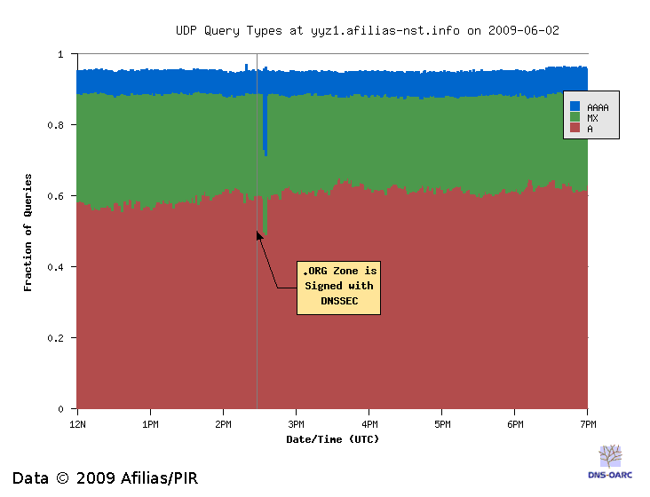 Prior to signing, the TCP traffic is just noise and should be ignored. After signing we see about 70% A, 15% MX, and 10% AAAA. This is more-or-less normal. Upon comparison to the