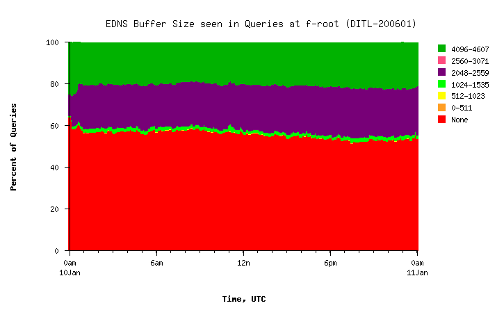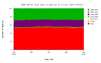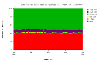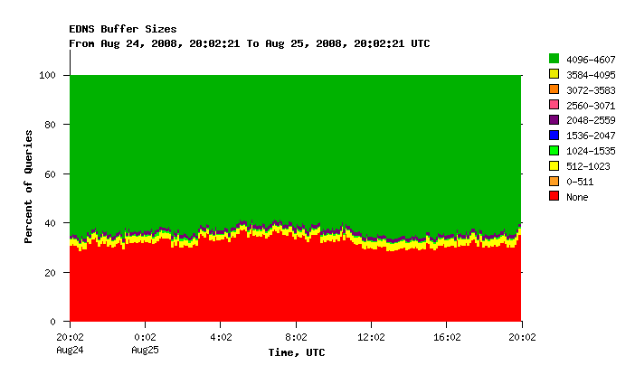 The trend is good news. Back in Jan 2007, 50% of queries did not indicate any EDNS support. 20% had bufsiz=2048, and 30% had bufsiz=4096. Now we have about 65% of queries with bufsiz=4096, while 35% still don't support EDNS.