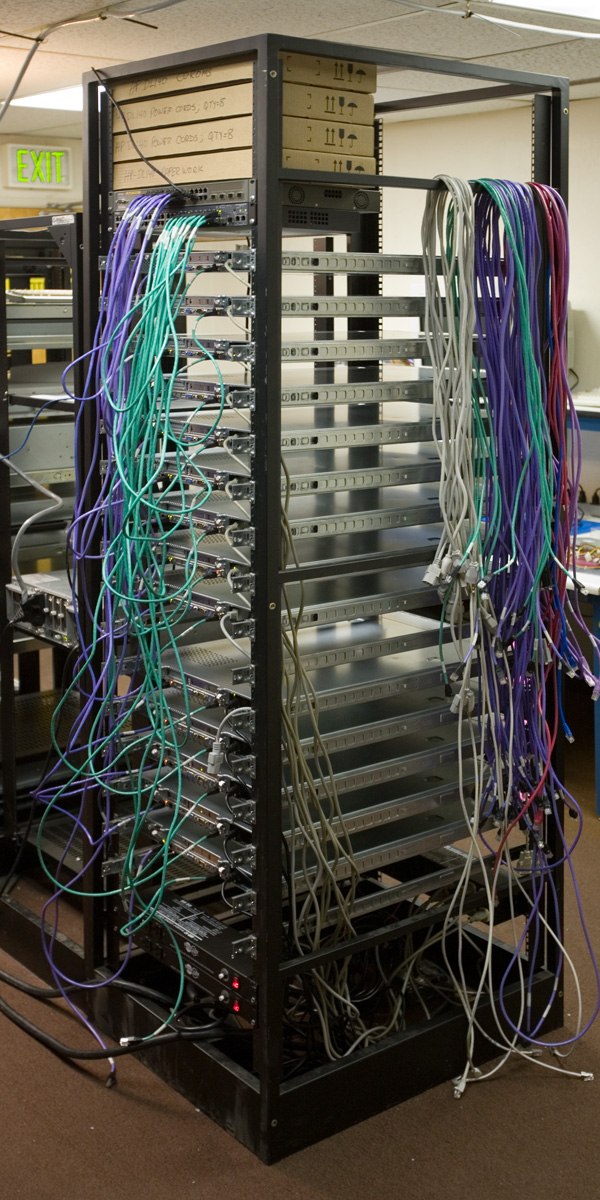 The OARC DNS testbed is a rack of servers and switches that can be used for simulations and performance testing. The rack contains: