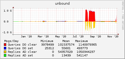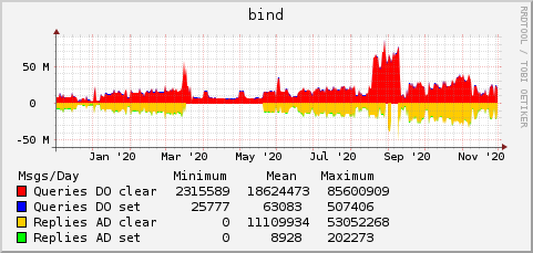 These graphs, updated nightly, show the number of queries received with and without the "DO" bit set, and the number of responses sent with and without the "AD" bit set.